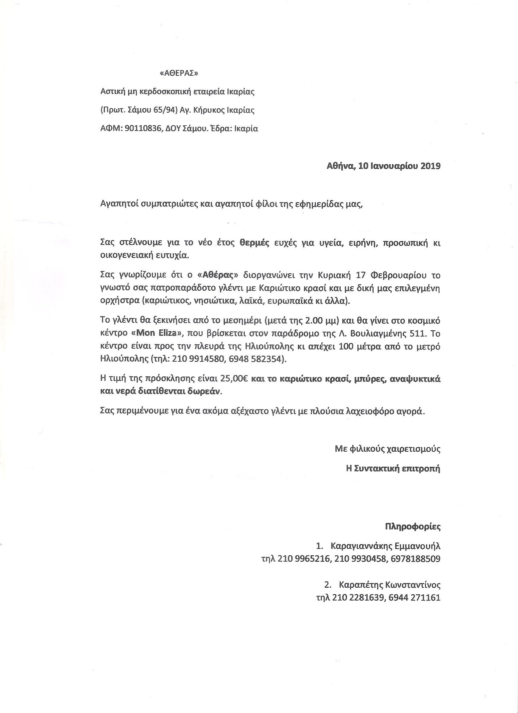 The post Πρόσκληση στην ετήσια χοροεσπερίδα της εφημερίδας »ΑΘΕΡΑΣ» appeared first on Ικαριακή Ραδιοφωνία.