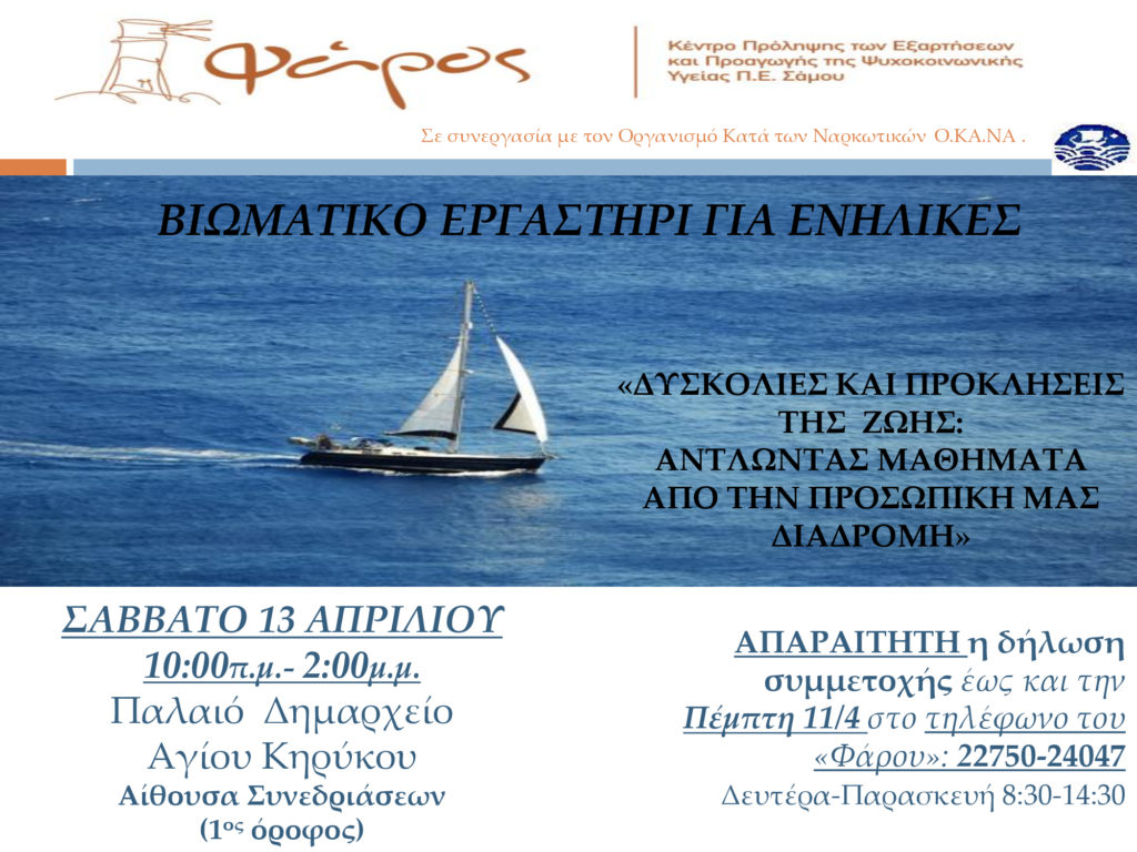 Το Κέντρο Πρόληψης των Εξαρτήσεων και Προαγωγής της Ψυχοκοινωνικής Υγείας Π.Ε. Σάμου «Φάρος» θα υλοποιήσει ένα βιωματικό εργαστήρι για ενήλικες με θέμα: